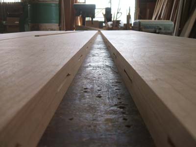 溝幅は前にも書いたが1/300くらいの勾配ですぼまっています。つまりこの天板は奥行きが500mmなので蟻溝は手前(入口)にくらべ一番奥は1.5mmくらいすぼまっていることになります。この勾配によって桟が吸い付くように天板に付くことになります。だから「吸い付き桟」。