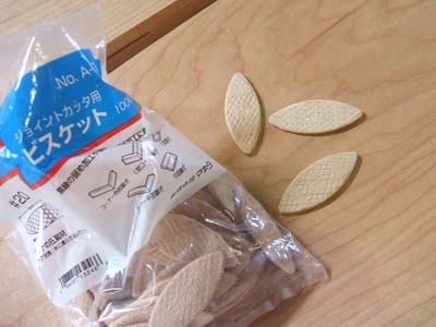 でこれがビスケット。サクッとしてて甘さ控えめで・・というのは冗談で、ブナのチップを圧縮したもの。ボンドの水分でふくれてさらに強度がアップ。