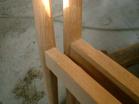 本物は成型合板で湾曲した四角形(うまく表現するボキャブラリーがありません・・・)ですが、それはちょいと無理なので、貫を「合いかぎ」にし、対角線でつなぎ、座面を貫に固定することで強度をだそうとしています。