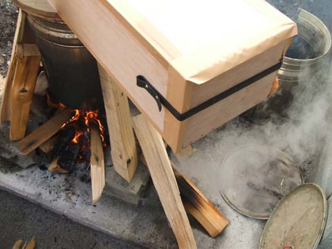 ↑まず蒸し器(スチーマー)とカマド。カマドは作ったが天候が雨のため今回はストーブの上に置いてみた。火力的にはやや不安。