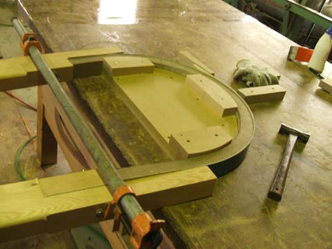 内側が圧縮され若干ひずんでる。曲げ木の理論上、外側が伸ばされ内側が圧縮されることは間違いないのだがこの歪みは果たしてしょうがないのか、それともなにか間違っているのか?とりあえず考えられる問題をしらみつぶしに考え変更し繰り返し曲げてみるしかないのか。